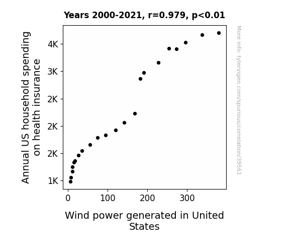 This means 95.9% of the change in the one variable (i.e., Wind power generated in United States) is predictable based on the change in the other (i.e., Annual US household spending on health insurance) over the 22 years from 2000 through 2021.