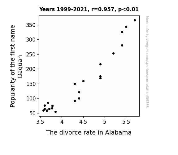 This means 91.6% of the change in the one variable (i.e., The divorce rate in Alabama) is predictable based on the change in the other (i.e., Popularity of the first name Daquan) over the 23 years from 1999 through 2021.