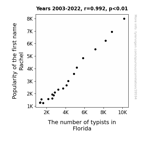 This means 98.4% of the change in the one variable (i.e., The number of typists in Florida) is predictable based on the change in the other (i.e., Popularity of the first name Rachel) over the 20 years from 2003 through 2022.