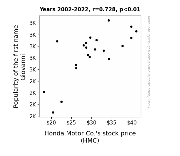 This means 53% of the change in the one variable (i.e., Honda Motor Co.'s stock price (HMC)) is predictable based on the change in the other (i.e., Popularity of the first name Giovanni) over the 21 years from 2002 through 2022.