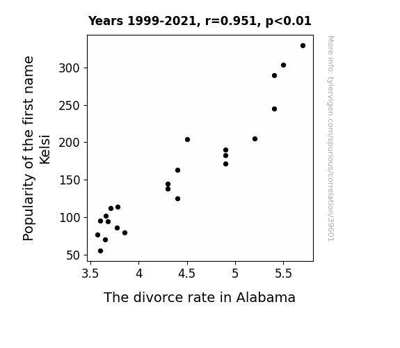 This means 90.5% of the change in the one variable (i.e., The divorce rate in Alabama) is predictable based on the change in the other (i.e., Popularity of the first name Kelsi) over the 23 years from 1999 through 2021.