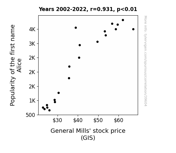 This means 86.7% of the change in the one variable (i.e., General Mills' stock price (GIS)) is predictable based on the change in the other (i.e., Popularity of the first name Alice) over the 21 years from 2002 through 2022.