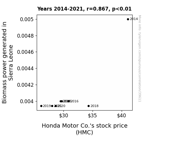 This means 75.2% of the change in the one variable (i.e., Honda Motor Co.'s stock price (HMC)) is predictable based on the change in the other (i.e., Biomass power generated in Sierra Leone) over the 8 years from 2014 through 2021.