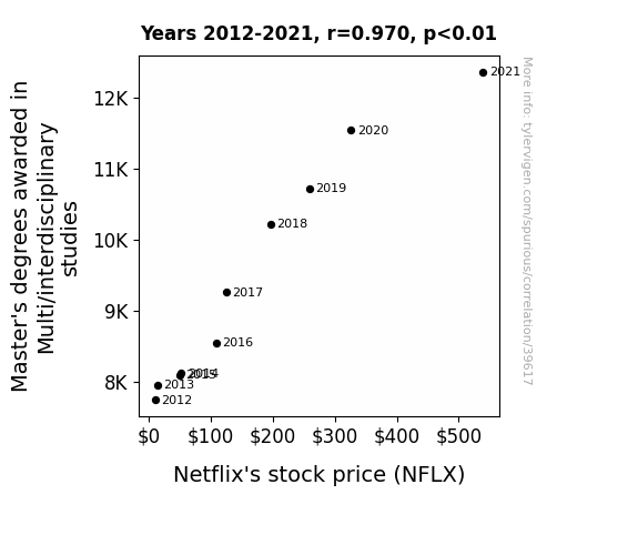 This means 94.2% of the change in the one variable (i.e., Netflix's stock price (NFLX)) is predictable based on the change in the other (i.e., Master's degrees awarded in Multi/interdisciplinary studies) over the 10 years from 2012 through 2021.