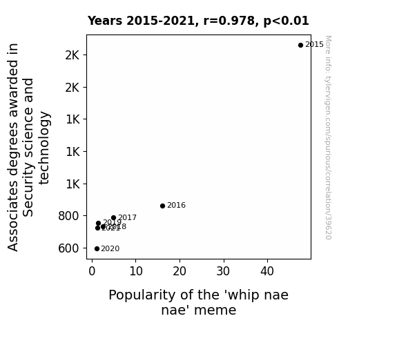 This means 95.7% of the change in the one variable (i.e., Popularity of the 'whip nae nae' meme) is predictable based on the change in the other (i.e., Associates degrees awarded in Security science and technology) over the 7 years from 2015 through 2021.