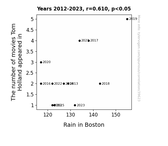 This means 37.2% of the change in the one variable (i.e., Rain in Boston) is predictable based on the change in the other (i.e., The number of movies Tom Holland appeared in) over the 12 years from 2012 through 2023.