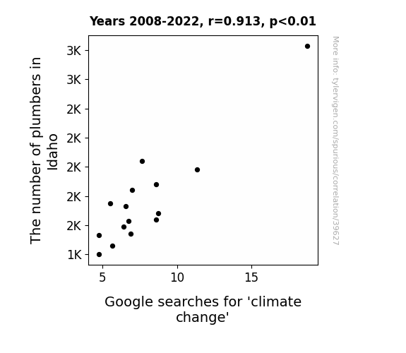 This means 83.3% of the change in the one variable (i.e., Google searches for 'climate change') is predictable based on the change in the other (i.e., The number of plumbers in Idaho) over the 15 years from 2008 through 2022.