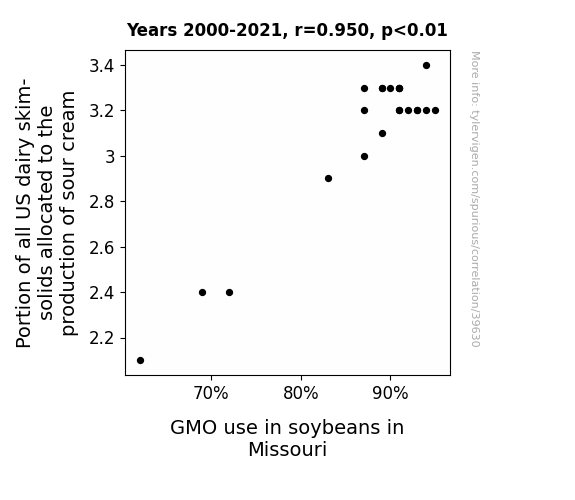 This means 90.3% of the change in the one variable (i.e., GMO use in soybeans in Missouri) is predictable based on the change in the other (i.e., Portion of all US dairy skim-solids allocated to the production of sour cream) over the 22 years from 2000 through 2021.
