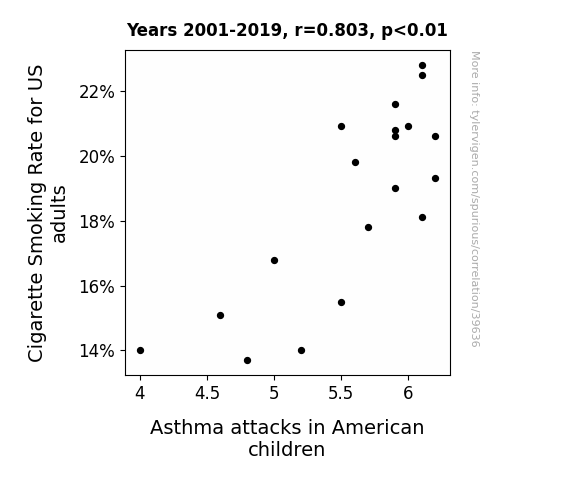 This means 64.4% of the change in the one variable (i.e., Asthma attacks in American children) is predictable based on the change in the other (i.e., Cigarette Smoking Rate for US adults) over the 19 years from 2001 through 2019.