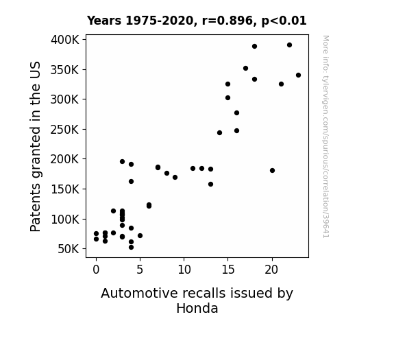 This means 80.2% of the change in the one variable (i.e., Automotive recalls issued by Honda) is predictable based on the change in the other (i.e., Patents granted in the US) over the 46 years from 1975 through 2020.