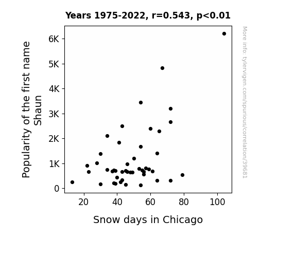 This means 29.4% of the change in the one variable (i.e., Snow days in Chicago) is predictable based on the change in the other (i.e., Popularity of the first name Shaun) over the 46 years from 1975 through 2022.