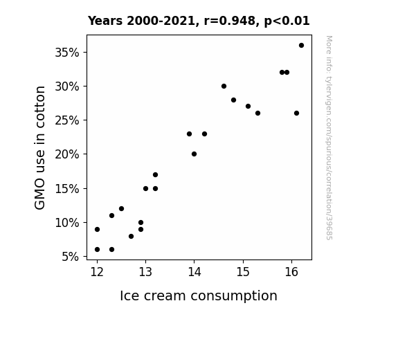 This means 90% of the change in the one variable (i.e., Ice cream consumption) is predictable based on the change in the other (i.e., GMO use in cotton) over the 22 years from 2000 through 2021.