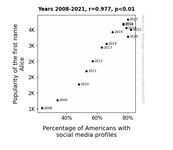 This means 95.4% of the change in the one variable (i.e., Percentage of Americans with social media profiles) is predictable based on the change in the other (i.e., Popularity of the first name Alice) over the 14 years from 2008 through 2021.