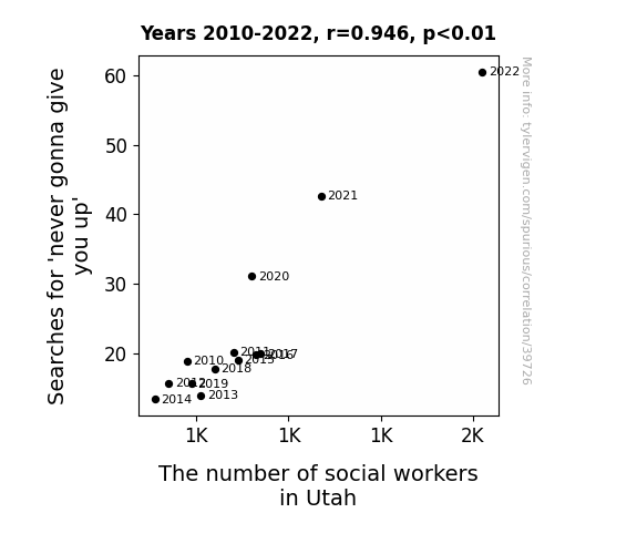 This means 89.5% of the change in the one variable (i.e., The number of social workers in Utah) is predictable based on the change in the other (i.e., Searches for 'never gonna give you up') over the 13 years from 2010 through 2022.