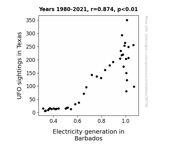 This means 76.4% of the change in the one variable (i.e., Electricity generation in Barbados) is predictable based on the change in the other (i.e., UFO sightings in Texas) over the 42 years from 1980 through 2021.