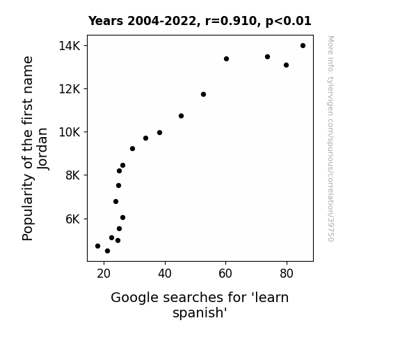This means 82.8% of the change in the one variable (i.e., Google searches for 'learn spanish') is predictable based on the change in the other (i.e., Popularity of the first name Jordan) over the 19 years from 2004 through 2022.