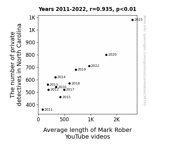 This means 87.5% of the change in the one variable (i.e., Average length of Mark Rober YouTube videos) is predictable based on the change in the other (i.e., The number of private detectives in North Carolina) over the 12 years from 2011 through 2022.