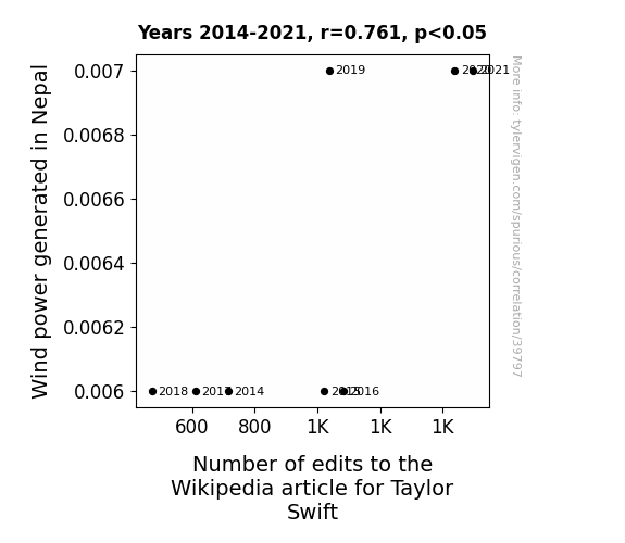 This means 57.9% of the change in the one variable (i.e., Number of edits to the Wikipedia article for Taylor Swift) is predictable based on the change in the other (i.e., Wind power generated in Nepal) over the 8 years from 2014 through 2021.