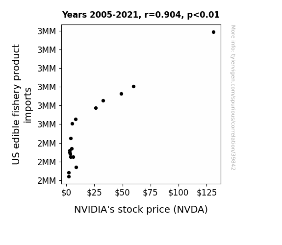 This means 81.8% of the change in the one variable (i.e., NVIDIA's stock price (NVDA)) is predictable based on the change in the other (i.e., US edible fishery product imports) over the 17 years from 2005 through 2021.
