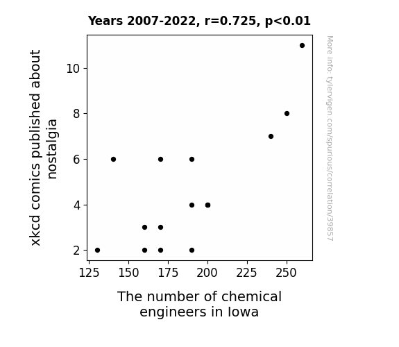 This means 52.5% of the change in the one variable (i.e., The number of chemical engineers in Iowa) is predictable based on the change in the other (i.e., xkcd comics published about nostalgia) over the 16 years from 2007 through 2022.