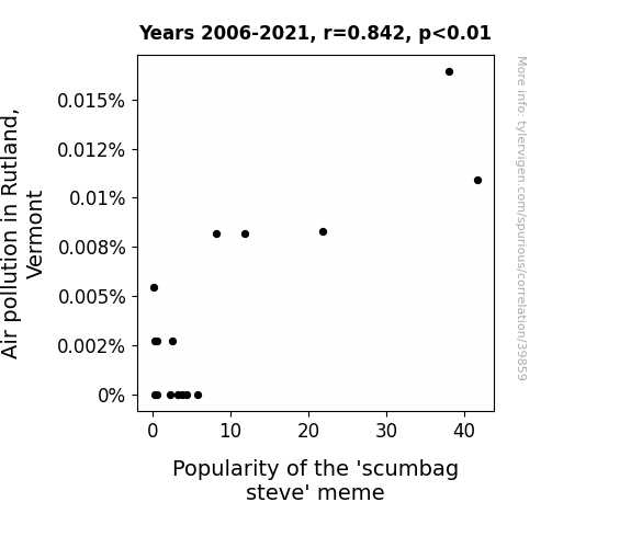 This means 71% of the change in the one variable (i.e., Popularity of the 'scumbag steve' meme) is predictable based on the change in the other (i.e., Air pollution in Rutland, Vermont) over the 16 years from 2006 through 2021.