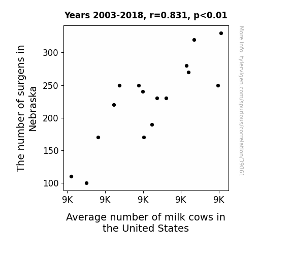 This means 69.1% of the change in the one variable (i.e., Average number of milk cows in the United States) is predictable based on the change in the other (i.e., The number of surgens in Nebraska) over the 16 years from 2003 through 2018.