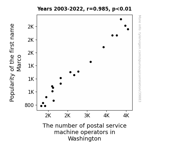 This means 97.1% of the change in the one variable (i.e., The number of postal service machine operators in Washington) is predictable based on the change in the other (i.e., Popularity of the first name Marco) over the 20 years from 2003 through 2022.