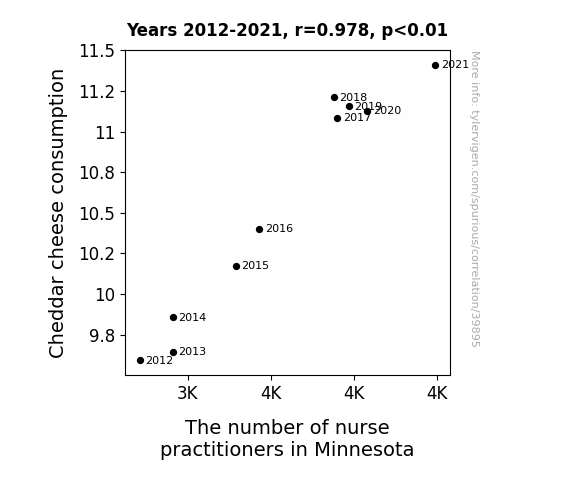 This means 95.7% of the change in the one variable (i.e., The number of nurse practitioners in Minnesota) is predictable based on the change in the other (i.e., Cheddar cheese consumption) over the 10 years from 2012 through 2021.