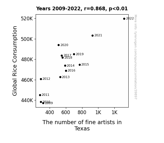This means 75.3% of the change in the one variable (i.e., The number of fine artists in Texas) is predictable based on the change in the other (i.e., Global Rice Consumption) over the 14 years from 2009 through 2022.