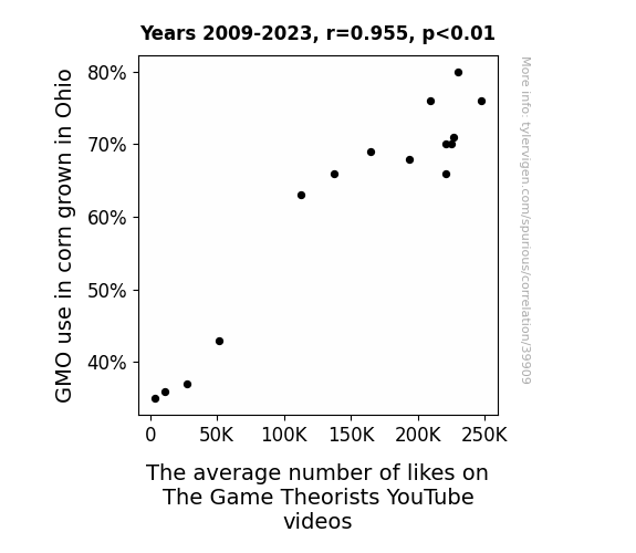 This means 91.3% of the change in the one variable (i.e., The average number of likes on The Game Theorists YouTube videos) is predictable based on the change in the other (i.e., GMO use in corn grown in Ohio) over the 15 years from 2009 through 2023.
