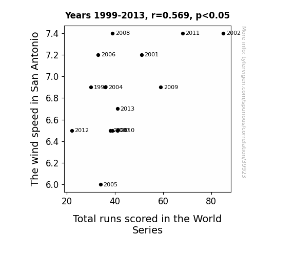This means 32.3% of the change in the one variable (i.e., Total runs scored in the World Series) is predictable based on the change in the other (i.e., The wind speed in San Antonio) over the 14 years from 1999 through 2013.