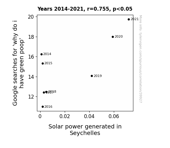 This means 57% of the change in the one variable (i.e., Solar power generated in Seychelles) is predictable based on the change in the other (i.e., Google searches for 'why do i have green poop') over the 8 years from 2014 through 2021.
