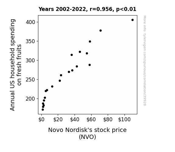 This means 91.3% of the change in the one variable (i.e., Novo Nordisk's stock price (NVO)) is predictable based on the change in the other (i.e., Annual US household spending on fresh fruits) over the 21 years from 2002 through 2022.