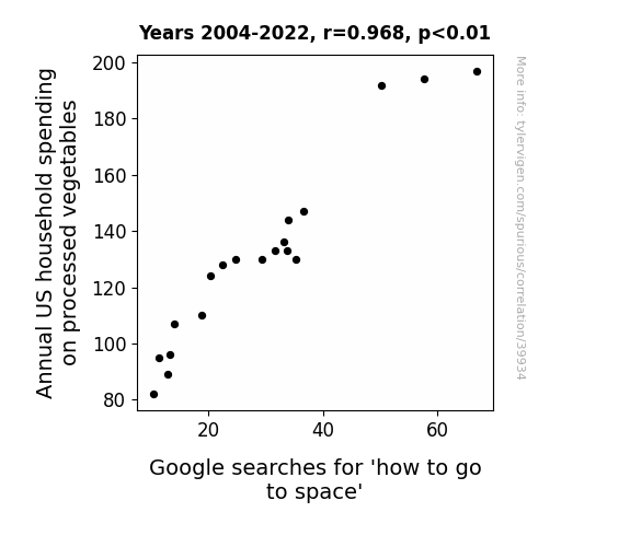 This means 93.7% of the change in the one variable (i.e., Google searches for 'how to go to space') is predictable based on the change in the other (i.e., Annual US household spending on processed vegetables) over the 19 years from 2004 through 2022.