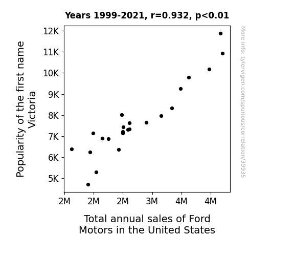 This means 86.9% of the change in the one variable (i.e., Total annual sales of Ford Motors in the United States) is predictable based on the change in the other (i.e., Popularity of the first name Victoria) over the 23 years from 1999 through 2021.