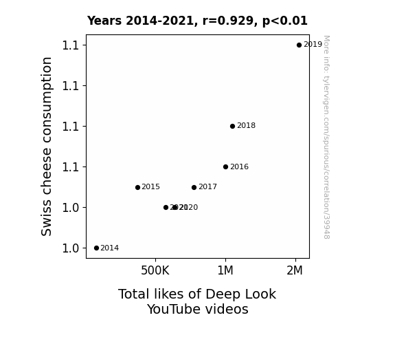 This means 86.2% of the change in the one variable (i.e., Total likes of Deep Look YouTube videos) is predictable based on the change in the other (i.e., Swiss cheese consumption) over the 8 years from 2014 through 2021.