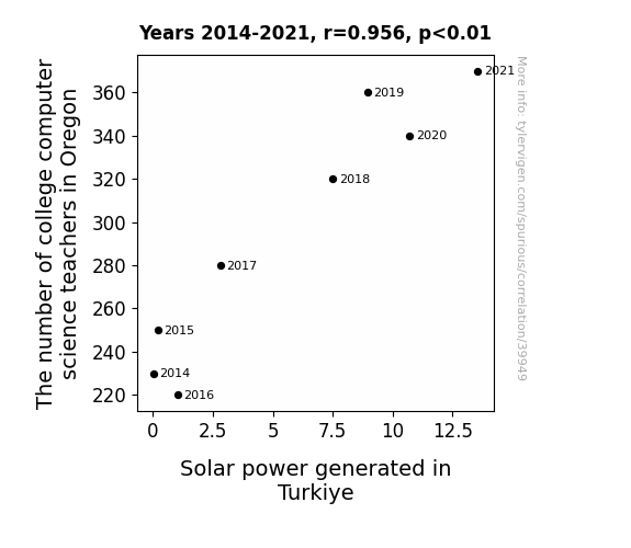 This means 91.3% of the change in the one variable (i.e., Solar power generated in Turkiye) is predictable based on the change in the other (i.e., The number of college computer science teachers in Oregon) over the 8 years from 2014 through 2021.