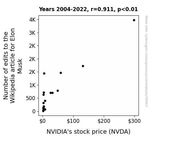 This means 83% of the change in the one variable (i.e., NVIDIA's stock price (NVDA)) is predictable based on the change in the other (i.e., Number of edits to the Wikipedia article for Elon Musk) over the 19 years from 2004 through 2022.