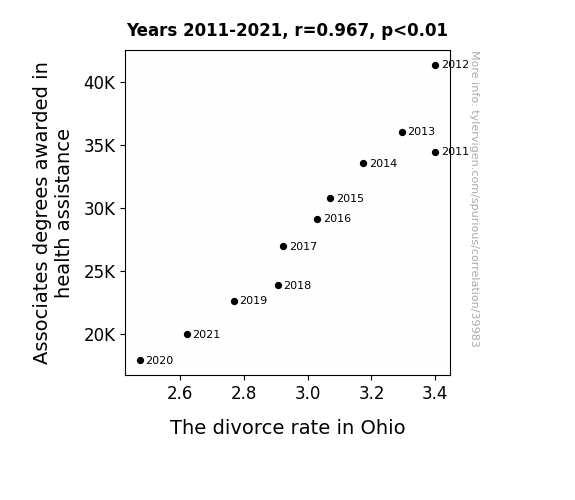 This means 93.5% of the change in the one variable (i.e., The divorce rate in Ohio) is predictable based on the change in the other (i.e., Associates degrees awarded in health assistance) over the 11 years from 2011 through 2021.