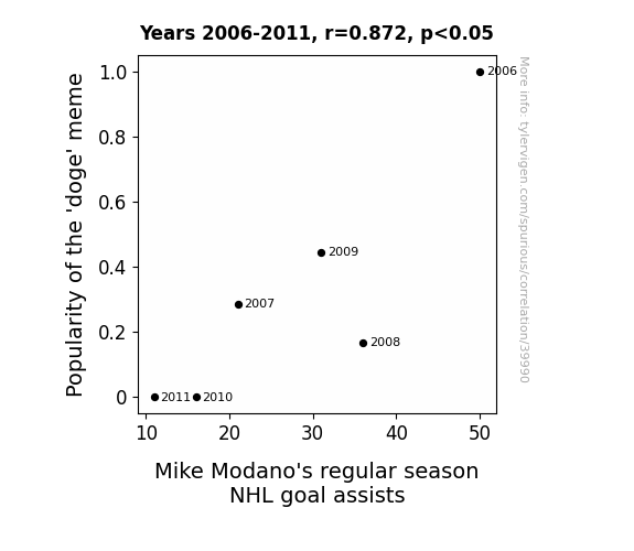 This means 76% of the change in the one variable (i.e., Mike Modano's regular season NHL goal assists) is predictable based on the change in the other (i.e., Popularity of the 'doge' meme) over the 6 years from 2006 through 2011.
