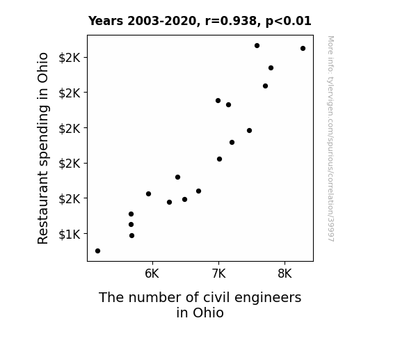 This means 87.9% of the change in the one variable (i.e., The number of civil engineers in Ohio) is predictable based on the change in the other (i.e., Restaurant spending in Ohio) over the 18 years from 2003 through 2020.