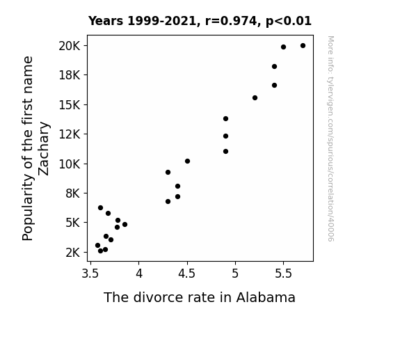 This means 94.8% of the change in the one variable (i.e., The divorce rate in Alabama) is predictable based on the change in the other (i.e., Popularity of the first name Zachary) over the 23 years from 1999 through 2021.