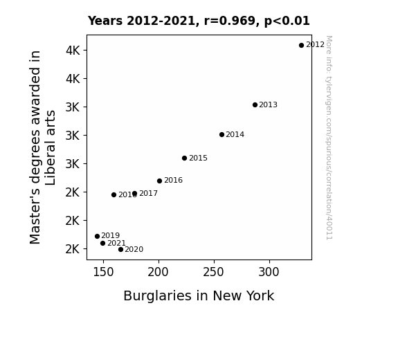 This means 94% of the change in the one variable (i.e., Burglaries in New York) is predictable based on the change in the other (i.e., Master's degrees awarded in Liberal arts) over the 10 years from 2012 through 2021.