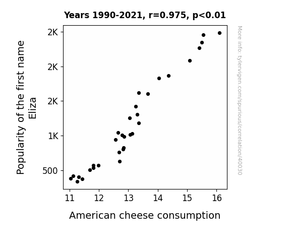 This means 95% of the change in the one variable (i.e., American cheese consumption) is predictable based on the change in the other (i.e., Popularity of the first name Eliza) over the 32 years from 1990 through 2021.
