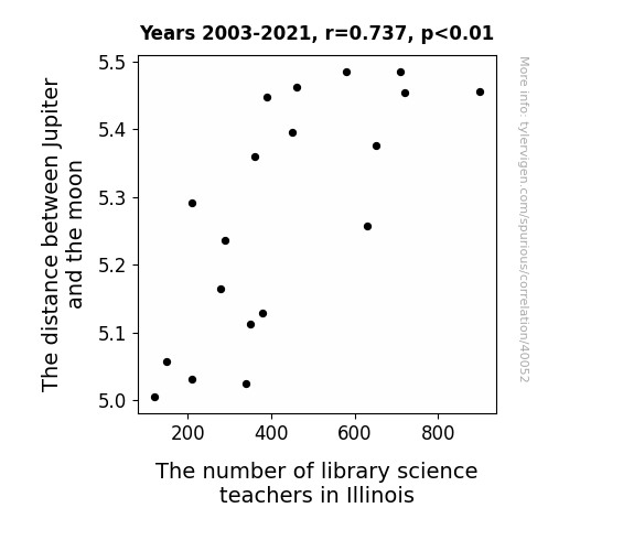 This means 54.3% of the change in the one variable (i.e., The number of library science teachers in Illinois) is predictable based on the change in the other (i.e., The distance between Jupiter and the moon) over the 19 years from 2003 through 2021.