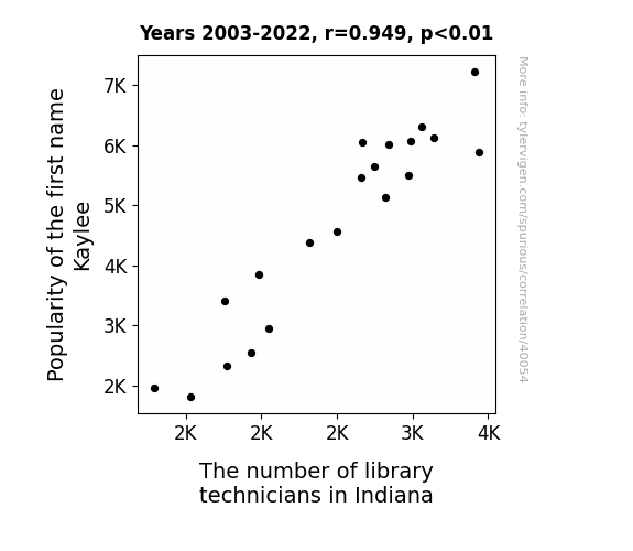 This means 90% of the change in the one variable (i.e., The number of library technicians in Indiana) is predictable based on the change in the other (i.e., Popularity of the first name Kaylee) over the 20 years from 2003 through 2022.