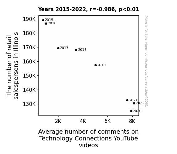 This means 97.2% of the change in the one variable (i.e., Average number of comments on Technology Connections YouTube videos) is predictable based on the change in the other (i.e., The number of retail salespersons in Illinois) over the 8 years from 2015 through 2022.