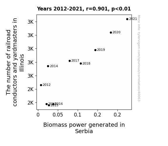 This means 81.2% of the change in the one variable (i.e., Biomass power generated in Serbia) is predictable based on the change in the other (i.e., The number of railroad conductors and yardmasters in Illinois) over the 10 years from 2012 through 2021.