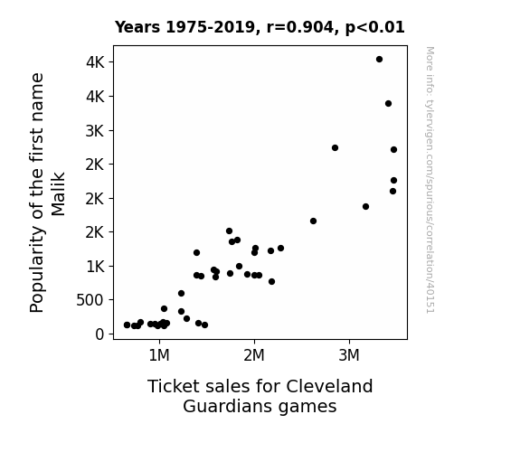 This means 81.7% of the change in the one variable (i.e., Ticket sales for Cleveland Guardians games) is predictable based on the change in the other (i.e., Popularity of the first name Malik) over the 45 years from 1975 through 2019.