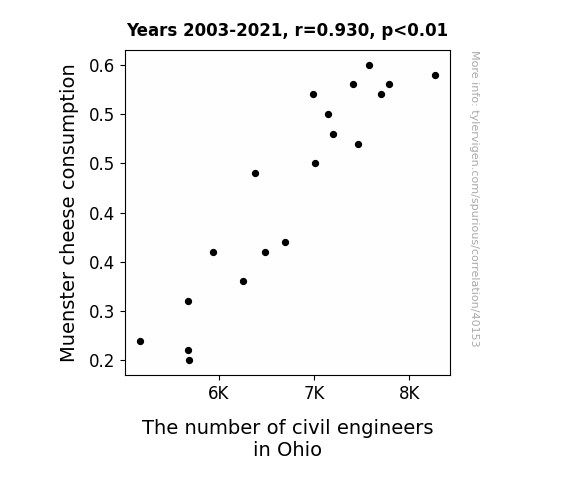 This means 86.4% of the change in the one variable (i.e., The number of civil engineers in Ohio) is predictable based on the change in the other (i.e., Muenster cheese consumption) over the 19 years from 2003 through 2021.